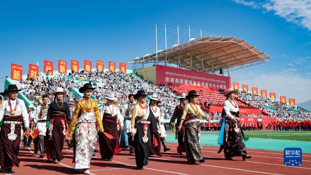 当日,青海省海南藏族自治州举行庆祝成立70周年大会。海南州民族体育场彩旗飘飘,歌声悠扬,各族群众身着盛装,满怀喜悦。