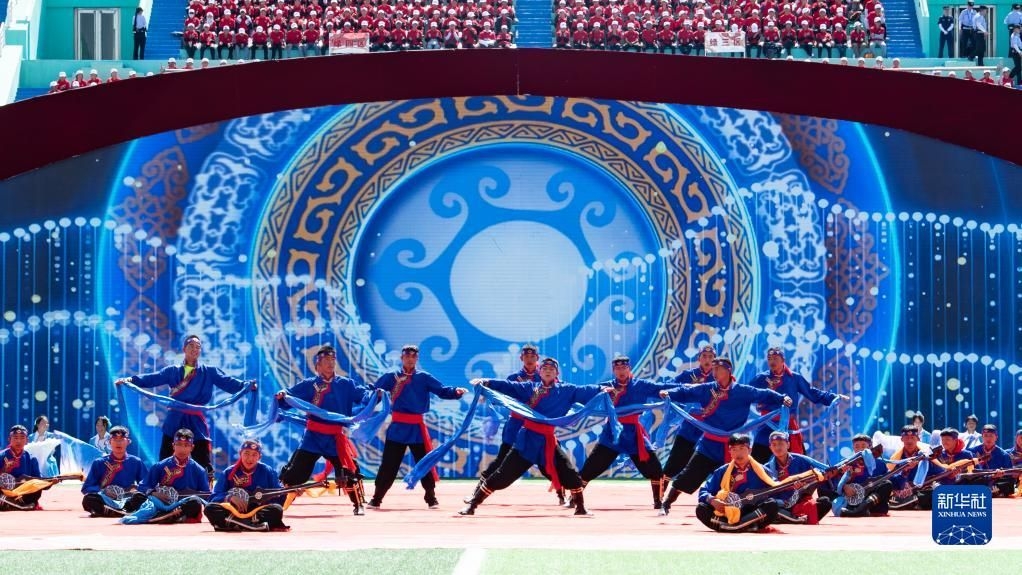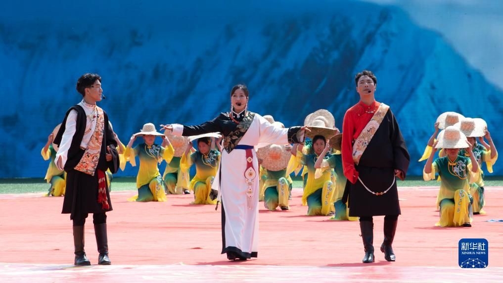 8月1日,当地群众在海南藏族自治州成立70周年庆祝大会上表演节目。