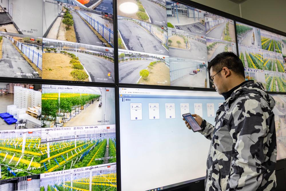 3月13日,技术人员在江苏省泰州市姜堰区溱湖智慧农业园数字化工厂通过远程智能温室控制系统,精准调控温、光、水、气、肥。新华社发(汤德宏 摄)