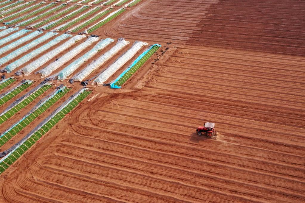 2月18日,在河南省沁阳市崇义镇南里村,农民驾驶农机在田间整地。新华社发(杨帆 摄)