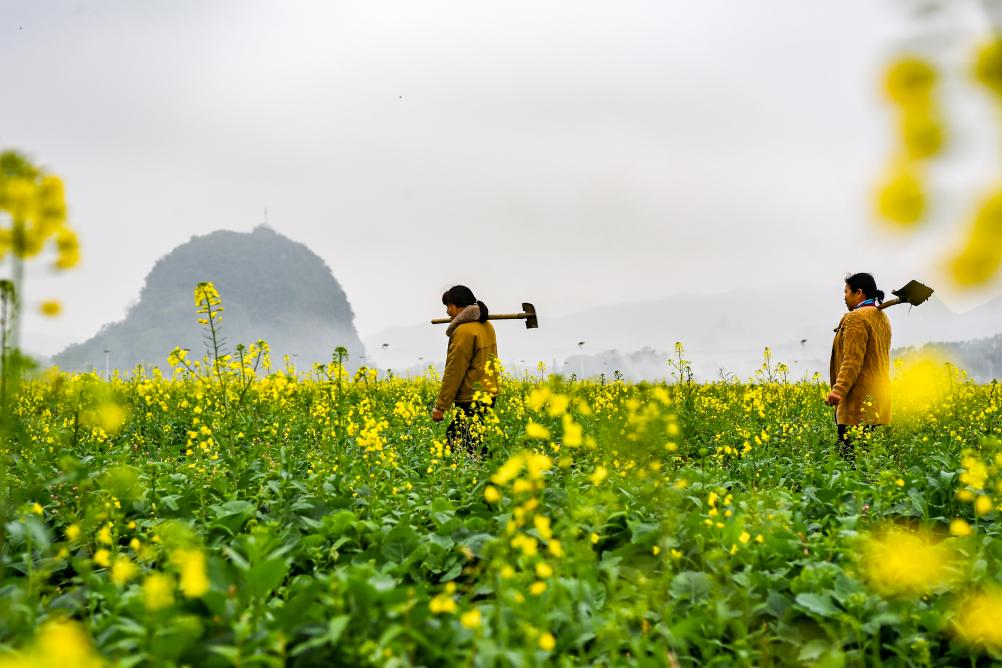 2月18日,在广西兴业县,两名村民扛着农具下田劳作。新华社记者 曹祎铭 摄