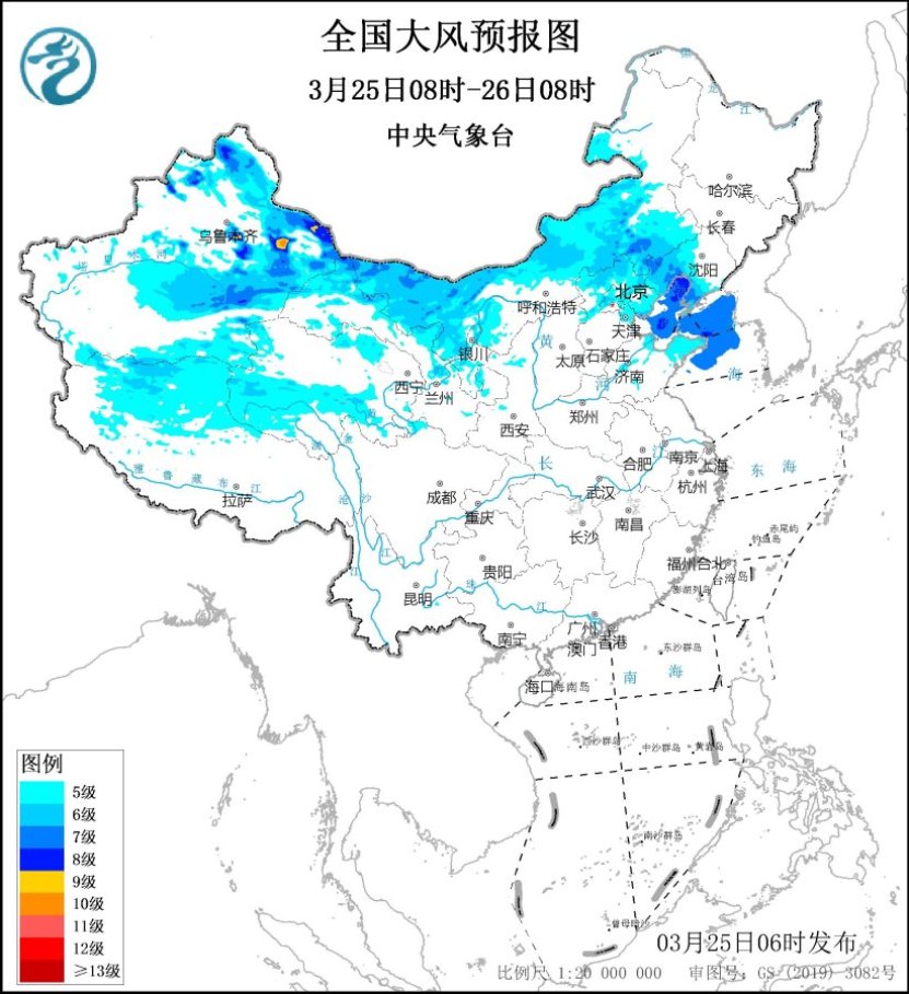 预计未来24小时,新疆北部、内蒙古中西部、辽宁中西部、西藏北部、青海西部、河北北部、北京大部、天津大部、山东北部和半岛地区等地有5~6级风、阵风7~9级,其中,新疆北部局地有7~9级风、阵风10~11级;渤海、渤海海峡、黄海北部和中部海域将有7~8级风、阵风9级。