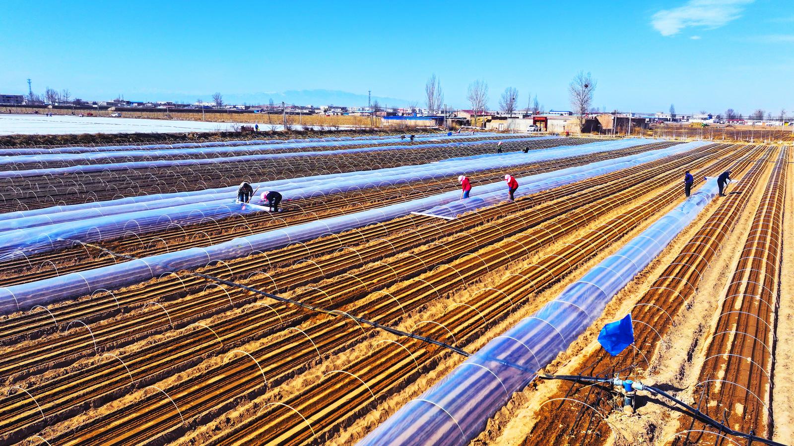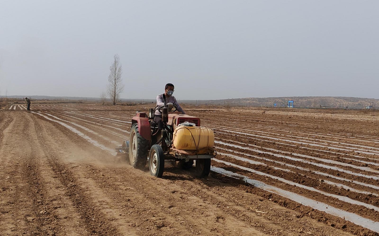 同样在直滩镇龙泉村村民柴宗权的农田里,覆膜也全程使用了机械化,随着覆膜机的匀速前行,一张张地膜整齐铺展,覆于垄上,在阳光下泛着微光。“我们从今天开始就铺地膜了,用的是覆膜机,省时省心又省力。我今年打算种20亩的玉米,因为去年雨水充足,我们就准备赶紧铺完了保墒。”柴宗权说。