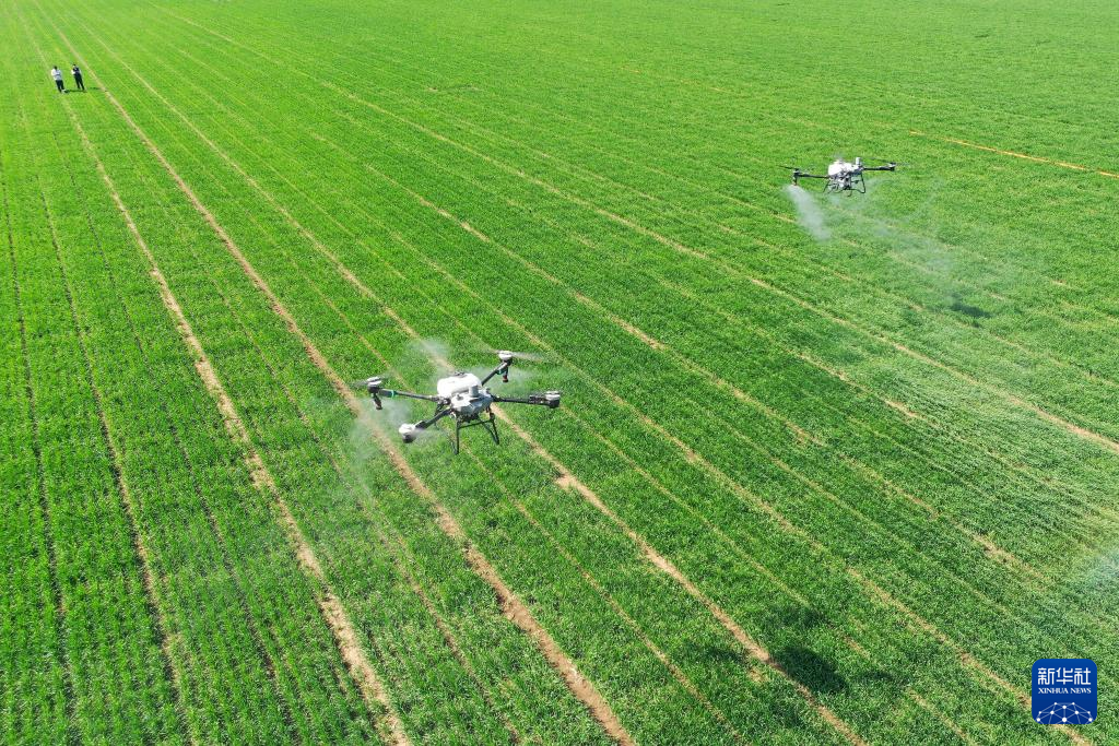 4月6日,在山东省青岛市即墨区段泊岚镇瓦戈庄村绿色增粮先行示范区,农民采用植保无人机为小麦喷洒叶面肥。