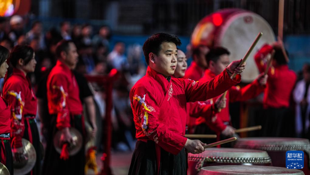4月13日,演员在启动仪式上表演“思州战鼓”。新华社记者 陶亮 摄
