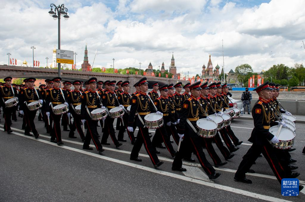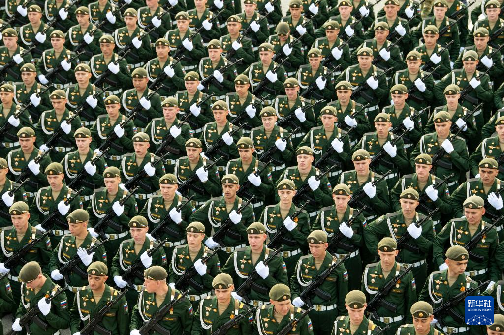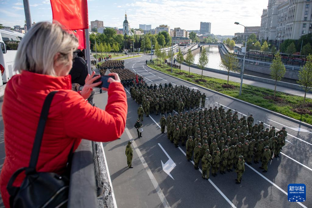 5月7日,在俄罗斯首都莫斯科,士兵列队准备参加纪念苏联伟大卫国战争胜利80周年阅兵式彩排。