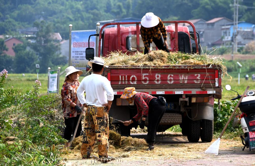 8月21日,在四川省宜宾市南溪区大观镇全福社区,村民正在高标准农田中进行收割作业。新华社记者 高健钧 摄