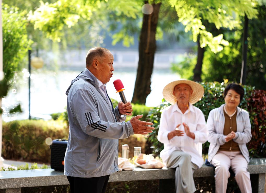 在山东省滕州市一处公园,市民正在演唱京剧。