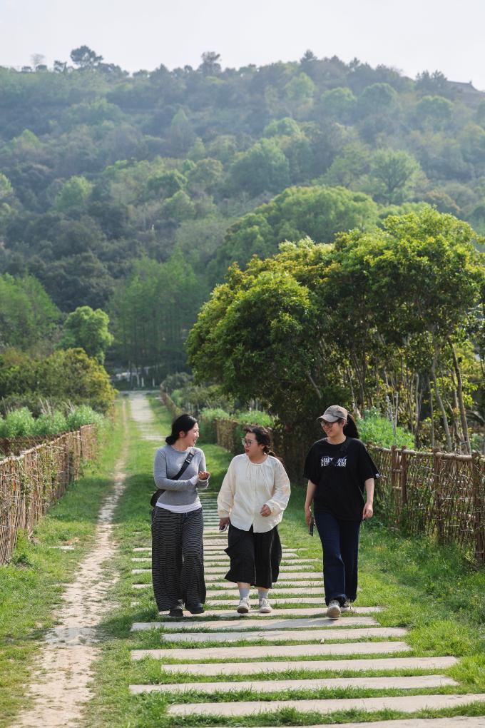 游客在浙江省慈溪市浒山街道施山社区施家山公共文化空间的口袋公园内散步。