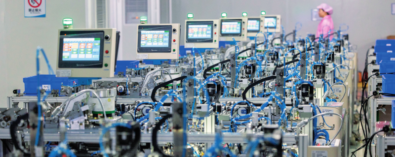 在江西赣州讯康电子科技有限公司,工作人员从T1—T2全自动穿环机旁走过,该机器生产磁性元器件(资料照片)。才扬摄/本刊