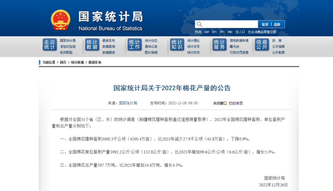 2022年我国棉花产量同比增长4.3% 单产有所提高