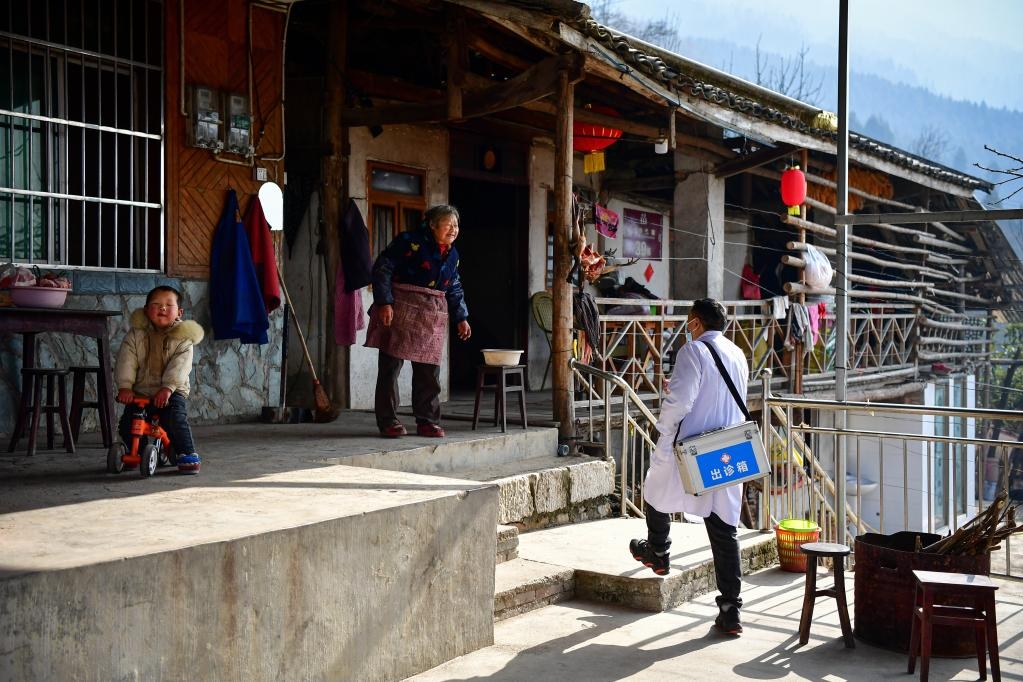 1月19日,在北川县曲山镇石椅村,村医赵太安入户走访重点人群。新华社记者 张超群 摄