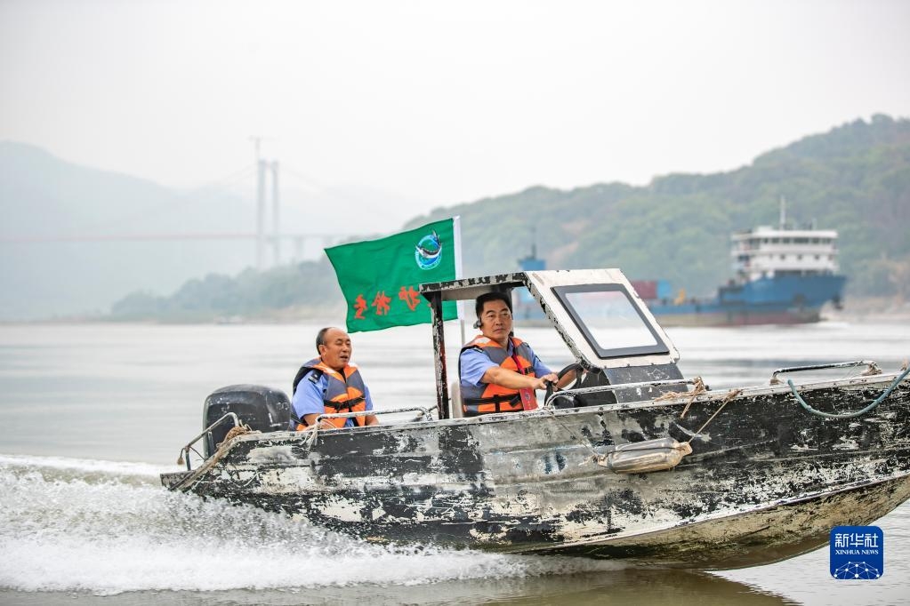 鸿鹄护鱼志愿队队长刘鸿(右)带领队员在长江重庆江津段巡护(2022年9月2日摄)。新华社记者 黄伟 摄