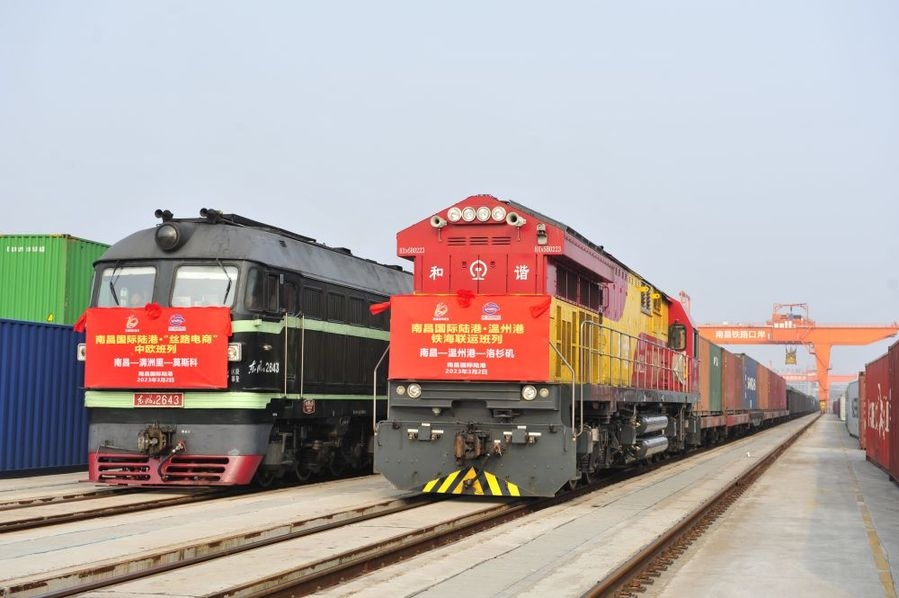2023年3月2日,“南昌-满洲里-莫斯科”中欧班列(左)、“南昌-温州港-洛杉矶”铁海联运班列准备从南昌国际陆港铁路口岸二期驶出。新华社记者 彭昭之 摄