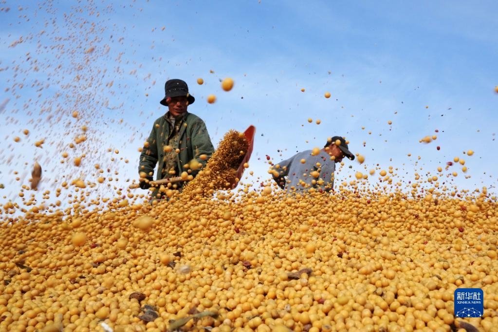 在北大荒农垦集团有限公司北安分公司赵光农场有限公司,工作人员在一处晒场的大豆堆上忙碌(2022年10月20日摄)。 新华社记者 王建威 摄