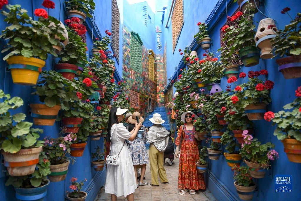 人们在新疆喀什古城景区彩虹巷内游玩拍照(6月14日摄)。新华社记者 胡虎虎 摄