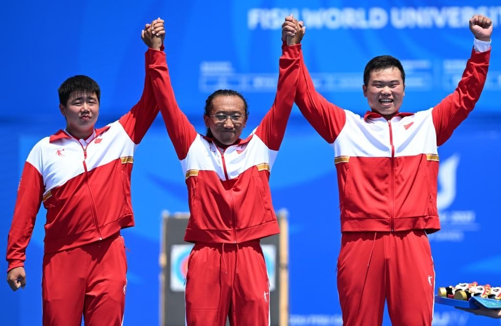 7月30日,中国队选手陈岩松、杜美余、王世坤(从左至右)在颁奖仪式上。当日,在成都举行的第31届世界大学生夏季运动会男子复合弓团体金牌赛中,中国队以231环:224环战胜法国队,获得冠军。新华社记者张龙摄