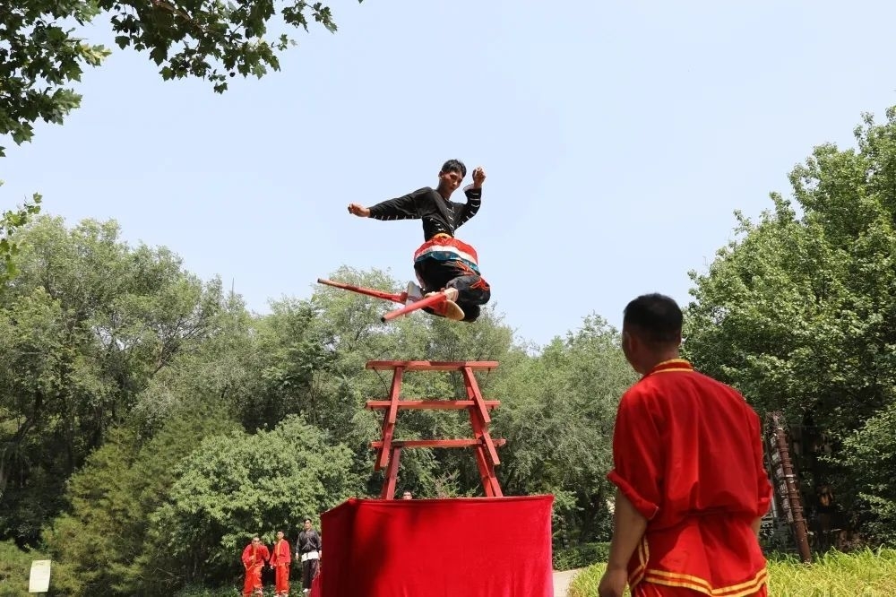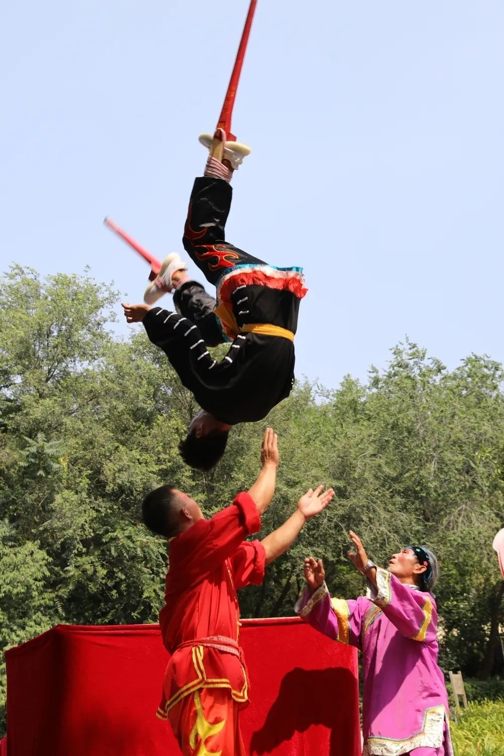 一群人踩着高跷跨过三层高櫈,满舞台“上下翻飞”,